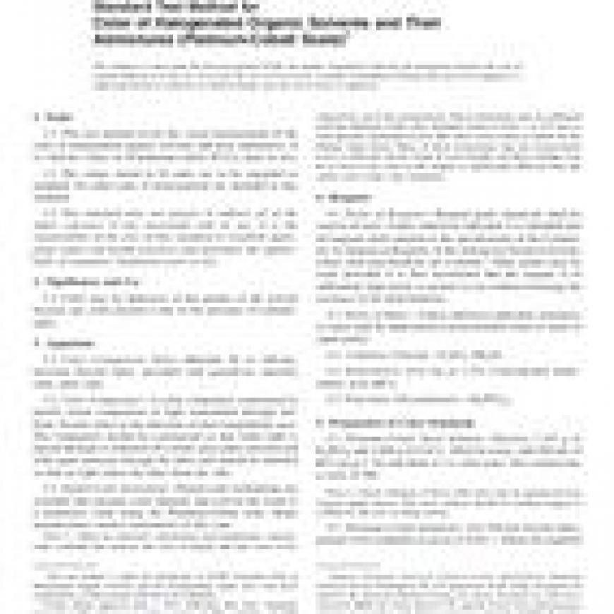 1.1This test method covers the visual measurement of the color of halogenated organic solvents and their admixtures. It is valid for values of 50 platinum-cobalt (Pt-Co) units or less.