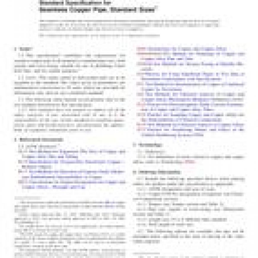 1.1This specification2 establishes the requirements for seamless copper pipe in all nominal or standard pipe sizes, both regular and extra-strong, suitable for use in plumbing, boiler feed lines, and for similar purposes.3
