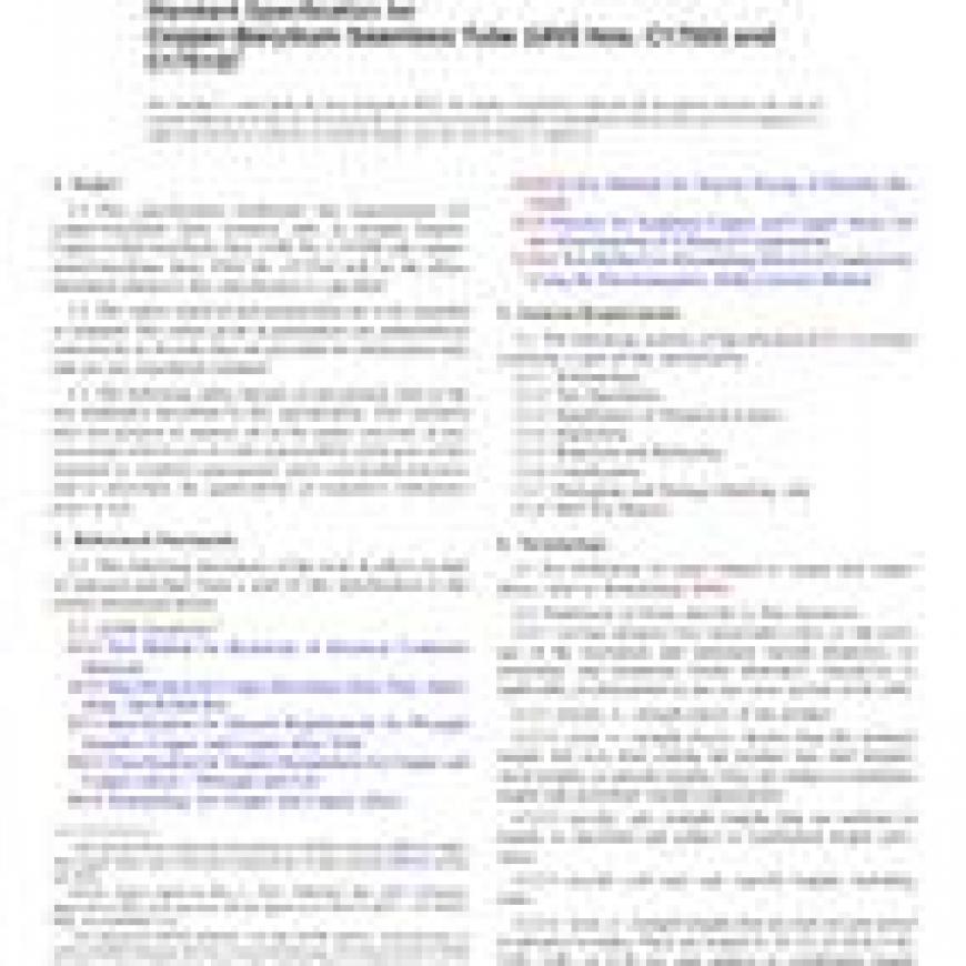 1.1This specification establishes the requirements for copper-beryllium alloy seamless tube in straight lengths. Copper-cobalt-beryllium alloy UNS No. C17500 and copper-nickel-beryllium alloy UNS No. C17510 will be the alloys furnished whenever this specification is specified.