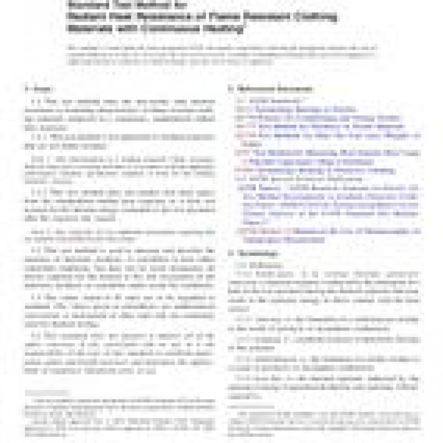 1.1This test method rates the non-steady state thermal resistance or insulating characteristics of flame resistant clothing materials subjected to a continuous, standardized radiant heat exposure.