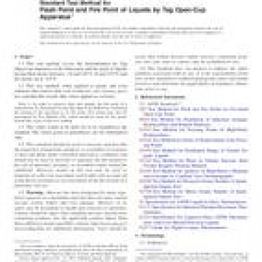 1.1This test method covers the determination by Tag Open-Cup Apparatus of the flash point and fire point of liquids having flash points between 18 and 165C (0 and 325F) and fire points up to 325F.