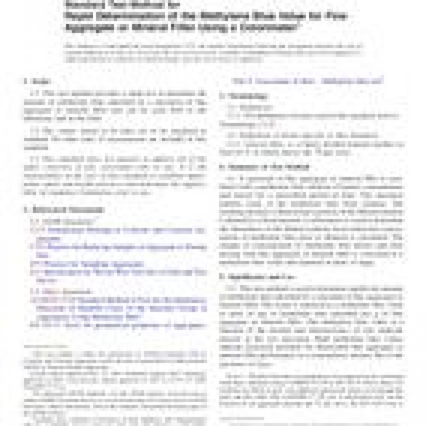 1.1This test method provides a rapid test to determine the amount of methylene blue adsorbed by a specimen of fine aggregate or mineral filler and can be used both in the laboratory and in the field.