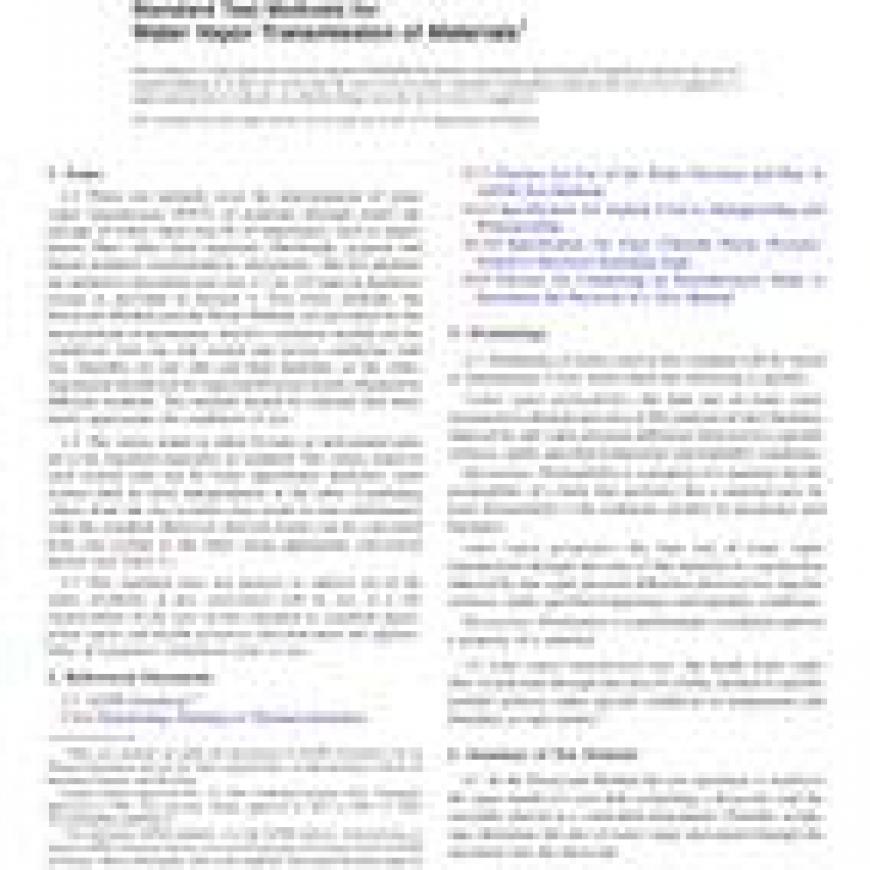 1.1These test methods cover the determination of water vapor transmission (WVT) of materials through which the passage of water vapor may be of importance, such as paper, plastic films, other sheet materials, fiberboards, gypsum and plaster products, wood products, and plastics. The test methods are limited to specimens not over 11/4in. [32 mm] in thickness except as provided in Section 9. Two basic methods, the Desiccant Method and the Water Method, are provided for the measurement of permeance, and two variations include service conditions with one side wetted and service conditions with low humidity on one side and high humidity on the other. Agreement should not be expected between results obtained by different methods. The method should be selected that more nearly approaches the conditions of use.