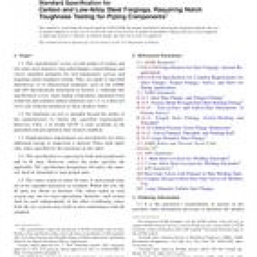 1.1This specification2 covers several grades of carbon and low-alloy steel forged or ring-rolled flanges, forged fittings and valves intended primarily for low-temperature service and requiring notch toughness testing. They are made to specified dimensions, or to dimensional standards, such as the ASME and API Specifications referenced in Section 2. Although this specification covers some piping components machined from rolled bar and seamless tubular materials (see 5.3.3), it does not cover raw material produced in these product forms.