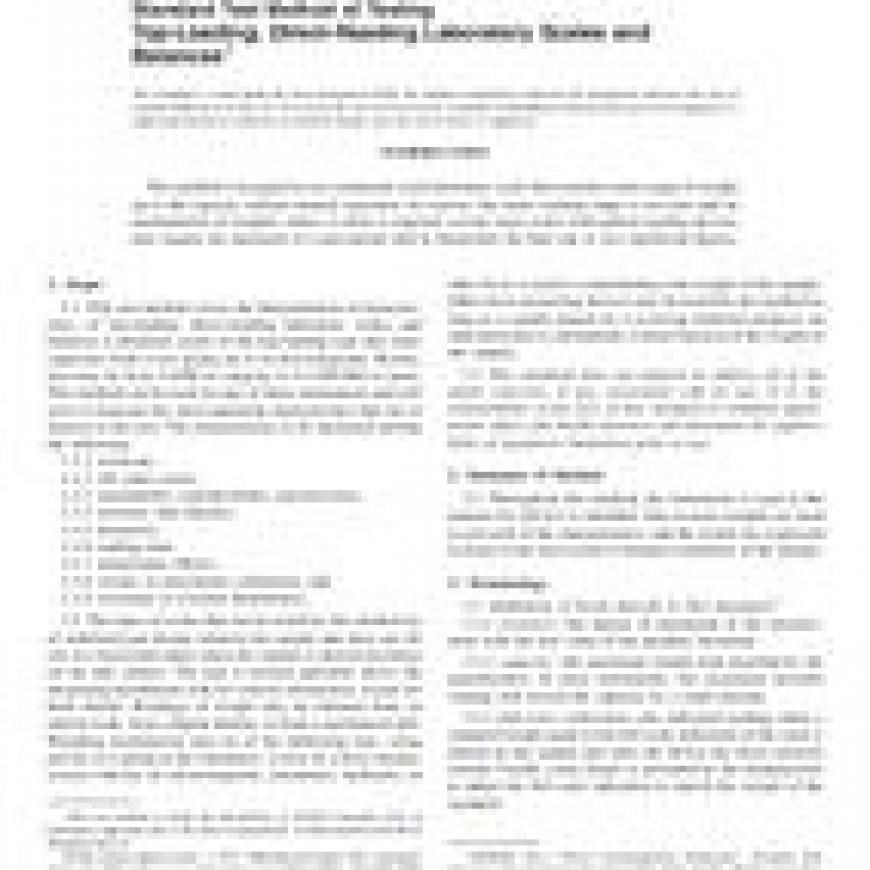 1.1This test method covers the determination of characteristics of top-loading, direct-reading laboratory scales and balances. Laboratory scales of the top-loading type may have capacities from a few grams up to several kilograms. Resolution may be from 1/1000 of capacity to 1/1000000 or more. This method can be used for any of these instruments and will serve to measure the most important characteristics that are of interest to the user. The characteristics to be measured include the following: