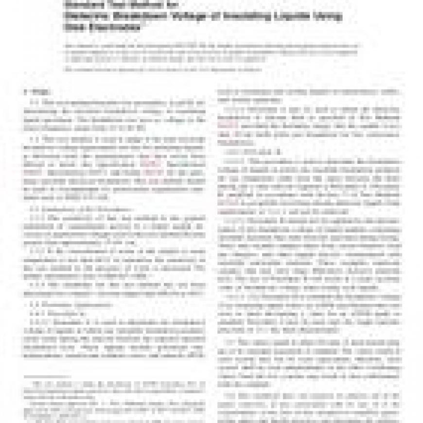 1.2This test method is used to judge if the disk electrode breakdown voltage requirements are met for insulating liquids, as delivered from the manufacturer, that have never been filtered or dried. See Specification D3487, Specification D4652, Specification D6871 and Guide D5222 for the minimum specified electrical breakdown. This test method should be used as recommended by professional organization standards such as IEEE C57.106.