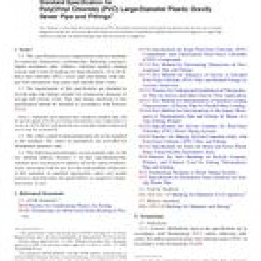 1.1This specification covers requirements and test methods for materials, dimensions, workmanship, flattening resistance, impact resistance, pipe stiffness, extrusion quality, joining system, and a form of marking for large diameters, 18 to 60 in. poly(vinyl chloride) (PVC) sewer pipe and fittings with integral bell elastomeric seal joints and smooth inner walls.