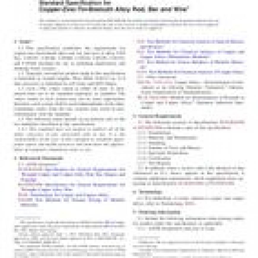 1.1 This specification establishes the requirements for copper-zinc-tin-bismuth alloy rod, bar and wire of alloy UNS Nos. C49255, C49260, C49300, C49340, C49350, C49355, and C49360 intended for use in plumbing applications and drinking water systems.