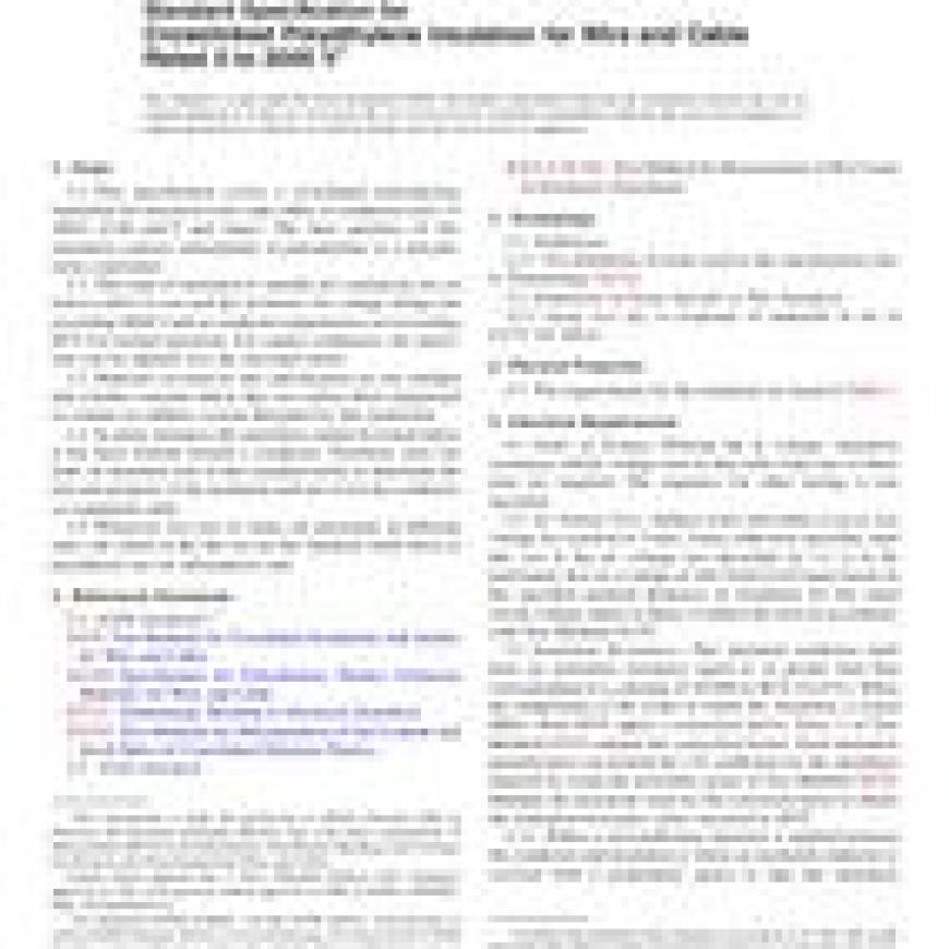 1.1 This specification covers a crosslinked polyethylene insulation for electrical wires and cables in conductor sizes 14 AWG [2.08 mm] and larger. The base polymer of this insulation consists substantially of polyethylene or a polyethylene copolymer.