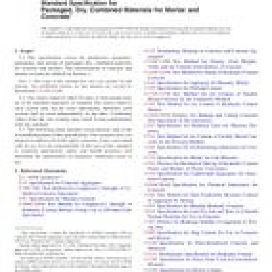 1.1 This specification covers the production, properties, packaging, and testing of packaged, dry, combined materials for concrete and mortars. The classifications of concrete and mortar covered are defined in Section 3.