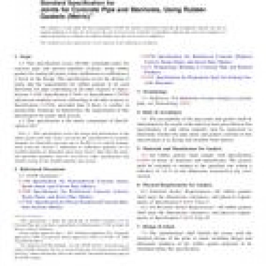 1.1 This specification covers flexible watertight joints for concrete pipe and precast manhole sections, using rubber gaskets for sealing the joints, where infiltration or exfiltration is a factor in the design. The specification covers the design of joints and the requirements for rubber gaskets to be used therewith, for pipe conforming in all other respects to Specification C14M, Specification C76M, or Specification C507M and precast manhole section conforming in all other respects to Specification C478M, provided that if there is conflict in permissible variations in dimensions, the requirements of this specification for joints shall govern.