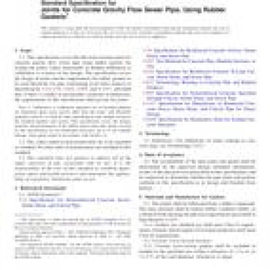 1.1 This specification covers flexible leak resistant joints for concrete gravity flow sewer pipe using rubber gaskets for sealing the joints, where measurable or defined infiltration or exfiltration is a factor of the design. The specification covers the design of joints and the requirements for rubber gaskets to be used therewith, for pipe conforming in all other respects to Specifications C14, C76, C655, C985, and C1417, provided that, if there is conflict in permissible variations in dimension, the requirements of this specification shall govern for joints.