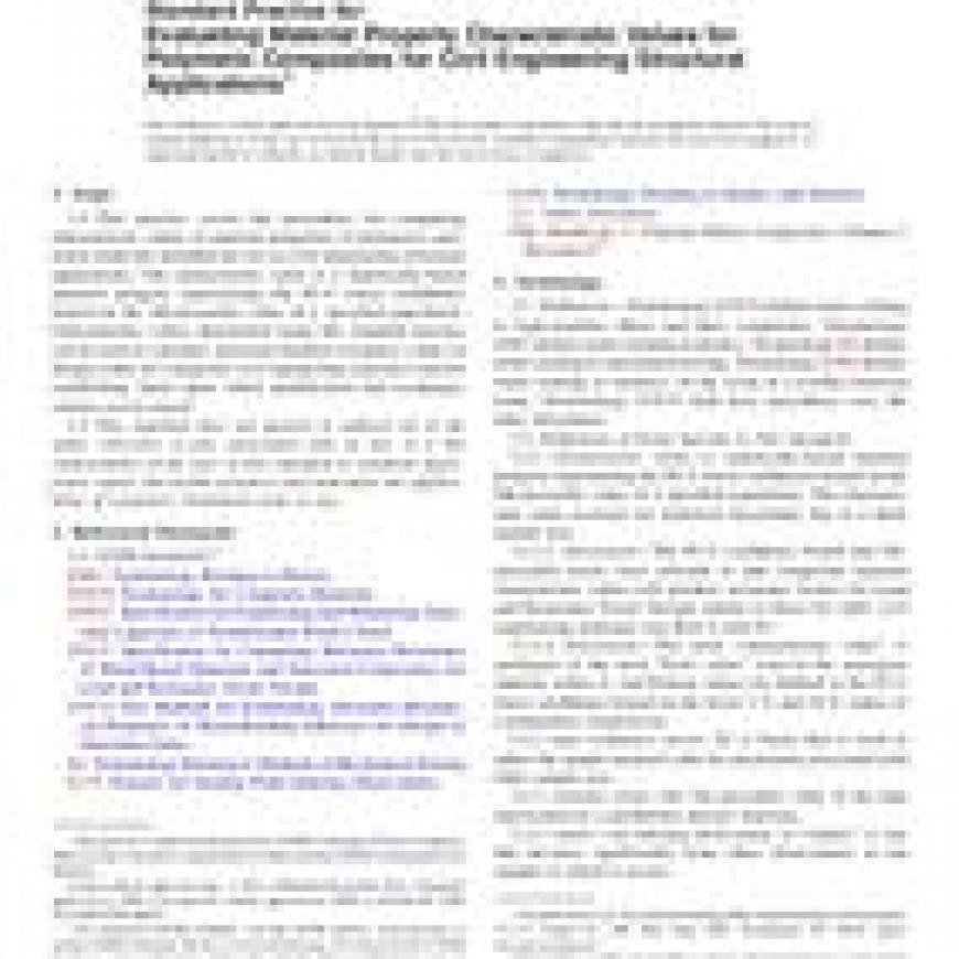 1.1 This practice covers the procedures for computing characteristic values of material properties of polymeric composite materials intended for use in civil engineering structural applications. The characteristic value is a statistically-based material property representing the 80 % lower confidence bound on the 5th-percentile value of a specified population. Characteristic values determined using this standard practice can be used to calculate structural member resistance values in design codes for composite civil engineering structures and for establishing limits upon which qualification and acceptance criteria can be based.