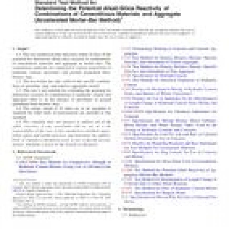 1.1 This test method permits detection within 16 days of the potential for deleterious alkali-silica reaction of combinations of cementitious materials and aggregate in mortar bars. The cementitious materials are composed of various proportions of hydraulic cement, pozzolans and ground granulated blast-furnace slag.