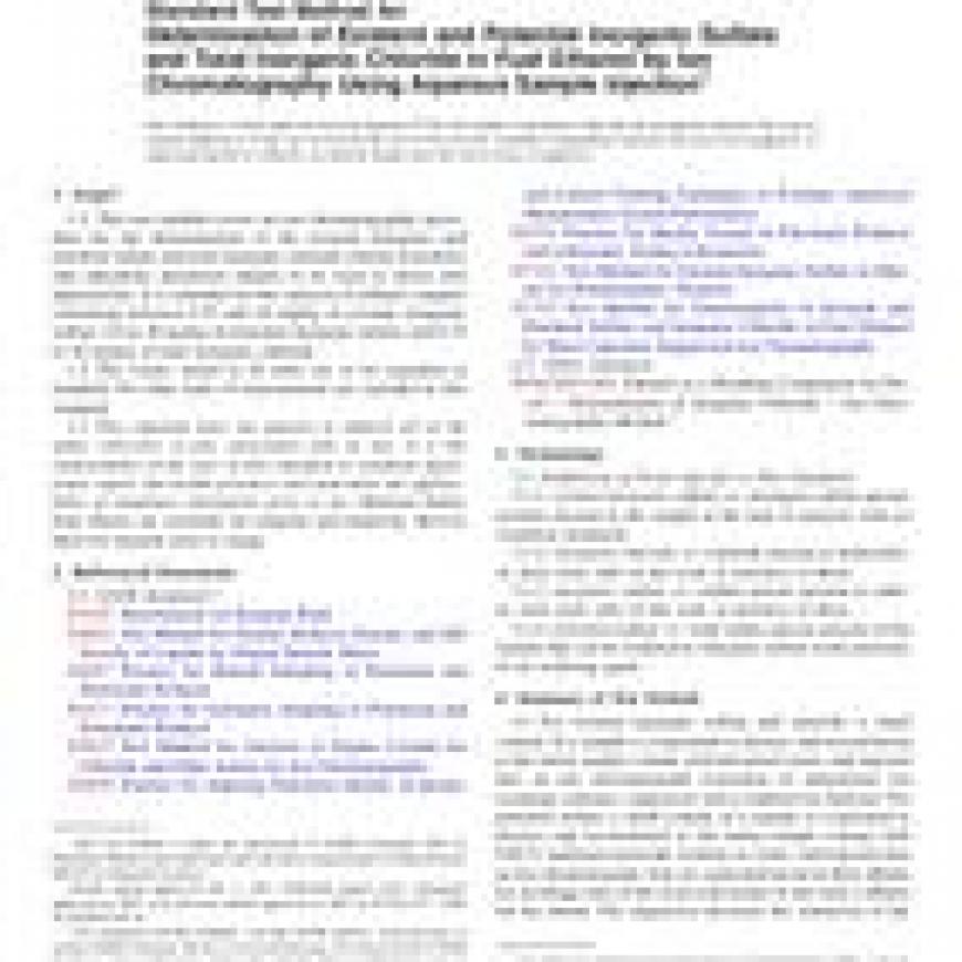 1.1 This test method covers an ion chromatographic procedure for the determination of the existent inorganic and potential sulfate and total inorganic chloride content in hydrous and anhydrous denatured ethanol to be used in motor fuel applications. It is intended for the analysis of ethanol samples containing between 0.55 and 20 mg/kg of existent inorganic sulfate, 4.0 to 20 mg/kg of potential inorganic sulfate, and 0.75 to 50 mg/kg of total inorganic chloride.