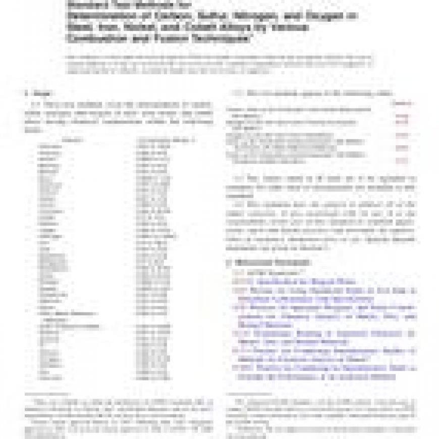 ASTM E1019-11 Standard Test Methods for Determination of Carbon, Sulfur, Nitrogen, and Oxygen in Steel, Iron, Nickel, and Cobalt Alloys by Various Combustion and Fusion Techniques