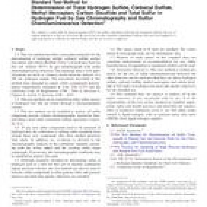 1.1 This test method describes a procedure primarily for the determination of hydrogen sulfide, carbonyl sulfide, methyl mercaptan, and carbon disulfide (Table 1) in hydrogen fuels for fuel cell vehicles (FCV) by gas chromatograph with sulfur chemiluminescence detection. The reporting limit is 0.02 ppbv (nanomole per mole as volume), based upon the analysis of a 500 mL hydrogen sample. The procedures described in this method were designed to satisfy sulfur contaminant determination requirements contained in SAE TIRJ2719 and the California Code of Regulations, CFR , Title 4, Division 9, Chapter 6, Article 8, Sections 4180 - 4181.