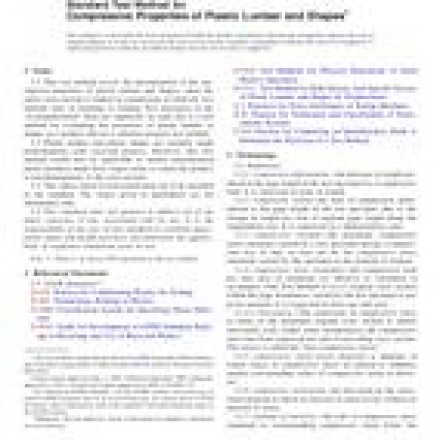1.1 This test method covers the determination of the mechanical properties of plastic lumber and shapes, when the entire cross-section is loaded in compression at relatively low uniform rates of straining or loading. Test specimens in the "as-manufactured" form are employed. As such, this is a test method for evaluating the properties of plastic lumber or shapes as a product and not a material property test method.