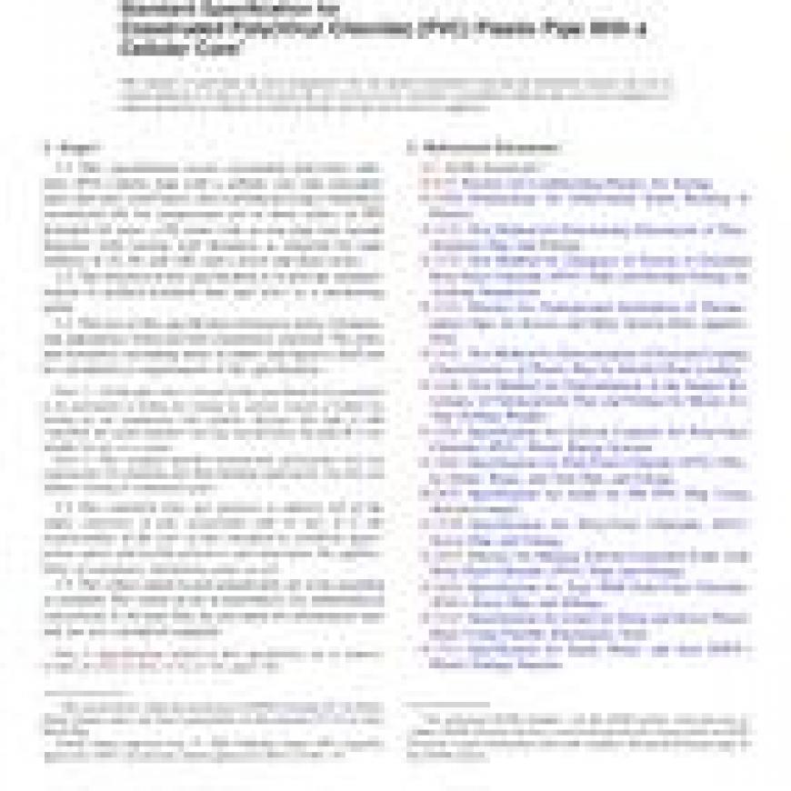 1.1 This specification covers coextruded poly(vinyl chloride) (PVC) plastic pipe with a cellular core and concentric inner and outer solid layers, and is produced using a multilayer coextrusion die for nonpressure use in three series: an IPS Schedule 40 series; a PS series with an iron pipe size outside diameter with varying wall thickness as required for pipe stiffness of 25, 50, and 100; and a sewer and drain series.
