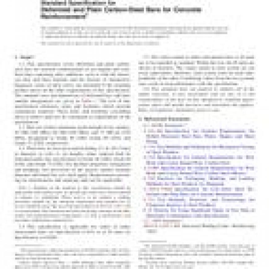 This specification covers deformed and plain carbon-steel bars for concrete reinforcements in cut lengths and coils. Materials considered under this specification are available in Grades 40 [280], 60 [420], and 75 [520]. Steel samples shall be rolled from properly identified heats of mold cast or strand cast steel using electric-furnace, basic-oxygen, or open-hearth. Heat analysis shall be performed wherein steel materials shall conform to required compositions of carbon, manganese, phosphorus, and sulfur. Steel specimens shall also undergo tensile tests and shall conform to required values of tensile strength, yield strength, and elongation. Steel samples shall also undergo deformation test, tension test and bend tests. Final products shall be marked by a tag.