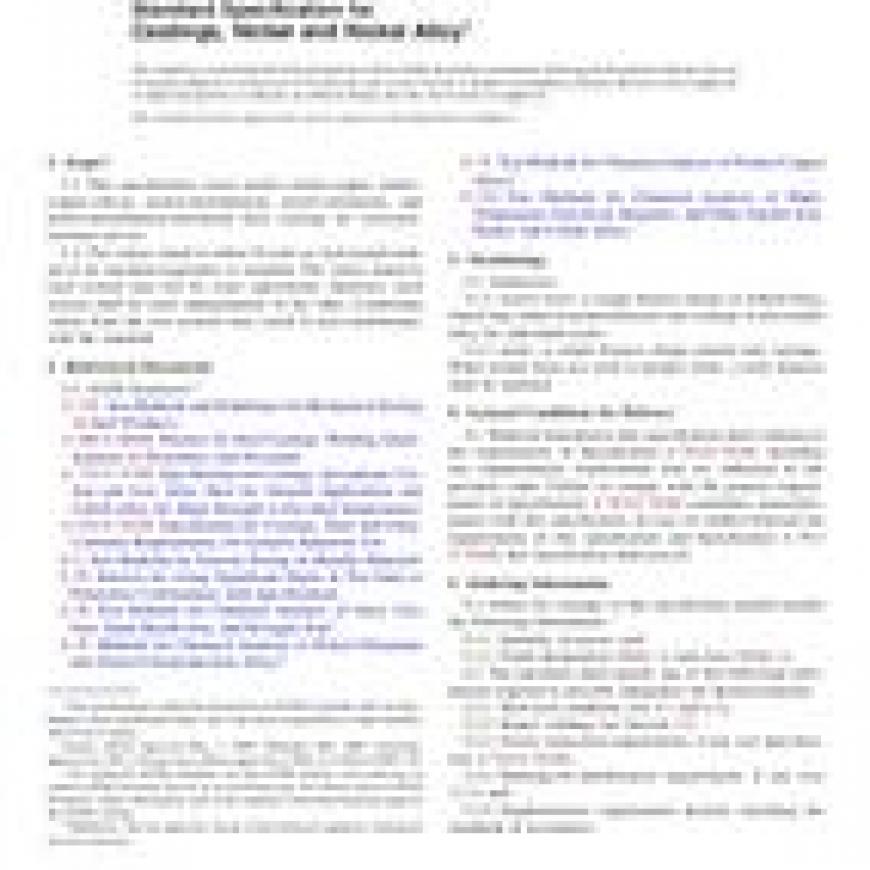 1.1 This specification covers nickel, nickel-copper, nickel-copper-silicon, nickel-molybdenum, nickel-chromium, and nickel-molybdenum-chromium alloy castings for corrosion-resistant service.