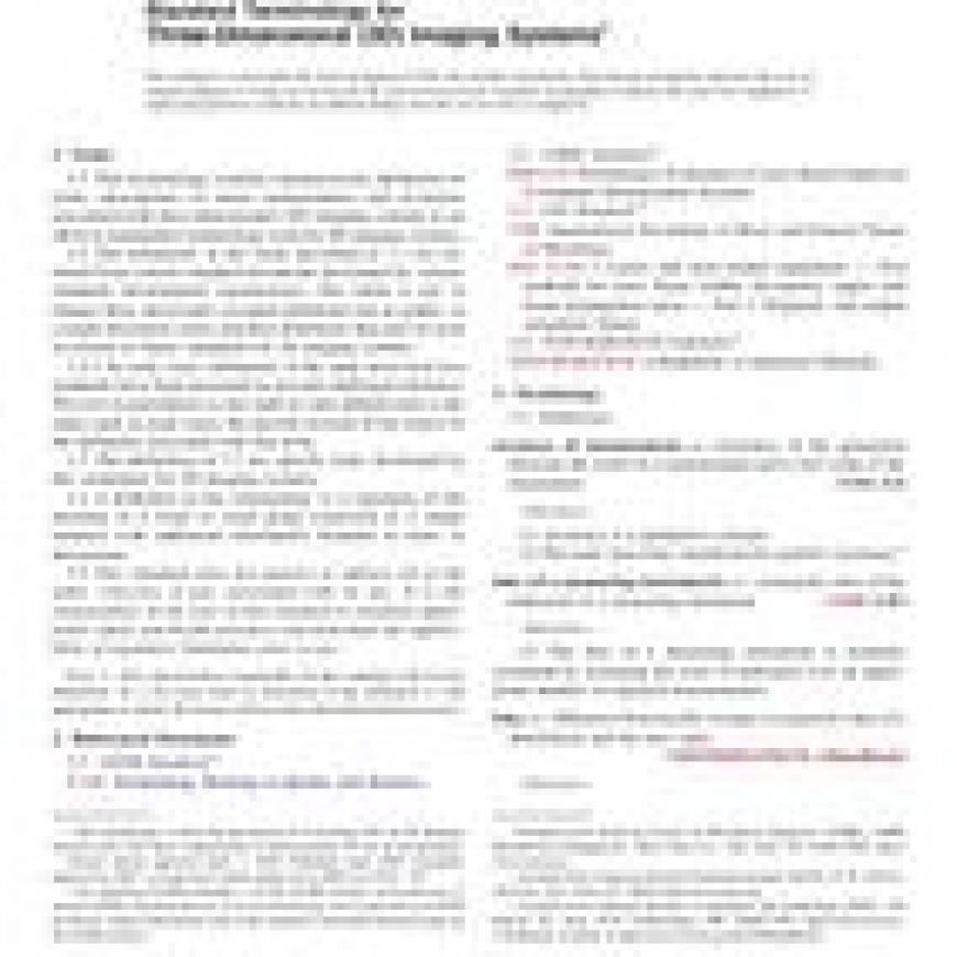 1.1 This terminology contains common terms, definitions of terms, descriptions of terms, nomenclature, and acronyms associated with three-dimensional (3D) imaging systems in an effort to standardize terminology used for 3D imaging systems.