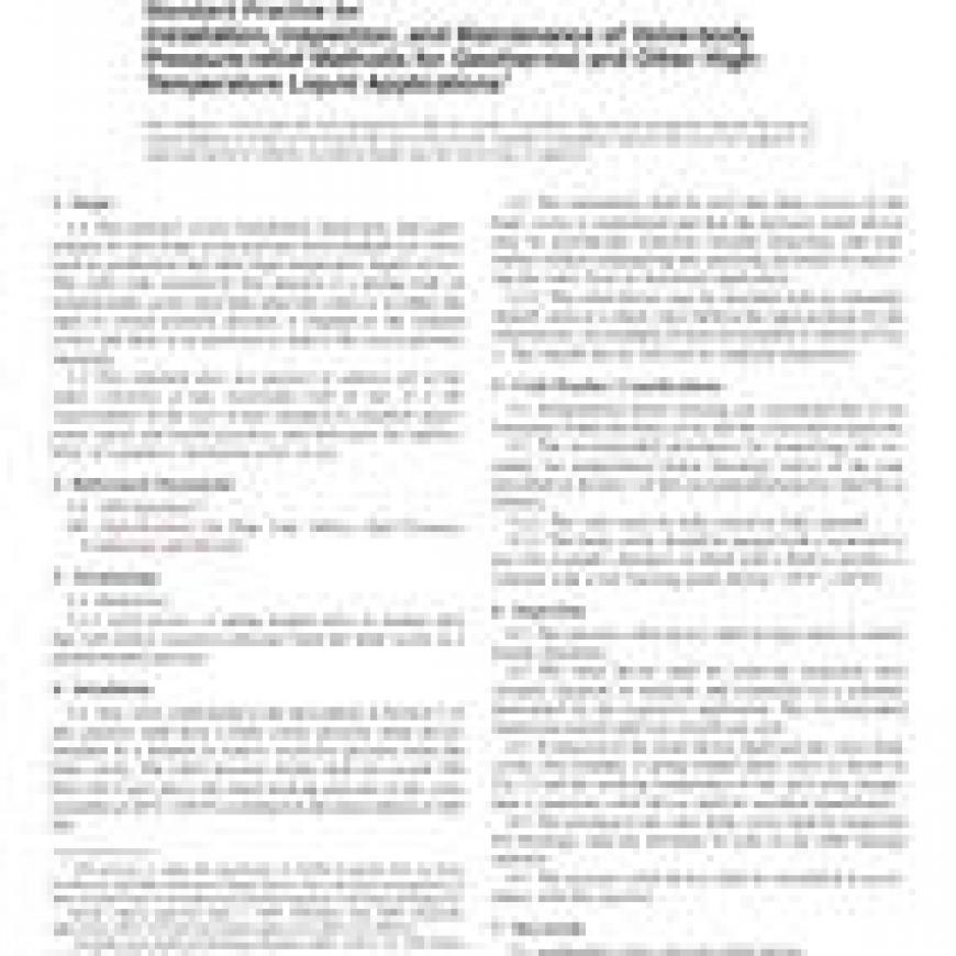 1.1 This practice covers installation, inspection, and maintenance of valve body cavity pressure relief methods for valves used in geothermal and other high-temperature liquid service. The valve type covered by this practice is a design with an isolated body cavity such that when the valve is in either the open or closed position pressure is trapped in the isolated cavity, and there is no provision to relieve the excess pressure internally.