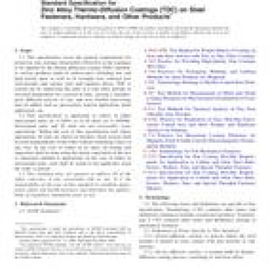 1.1 This specification covers the general requirements for protective zinc coatings (hereinafter referred to as the coatings) to be applied by the thermo-diffusion coating (TDC) method, to various products made of carbon steel, including low and high tensile parts as well as of wrought iron, sintered iron steel-powder and various steel and stainless alloys. TDC is carried out by immersing the parts in a zinc alloy powder at elevated temperature for a period of time, causing a metallurgical diffusion process of zinc and iron. Further processing may be added, such as, passivation, topcoat application, paint application, etc.