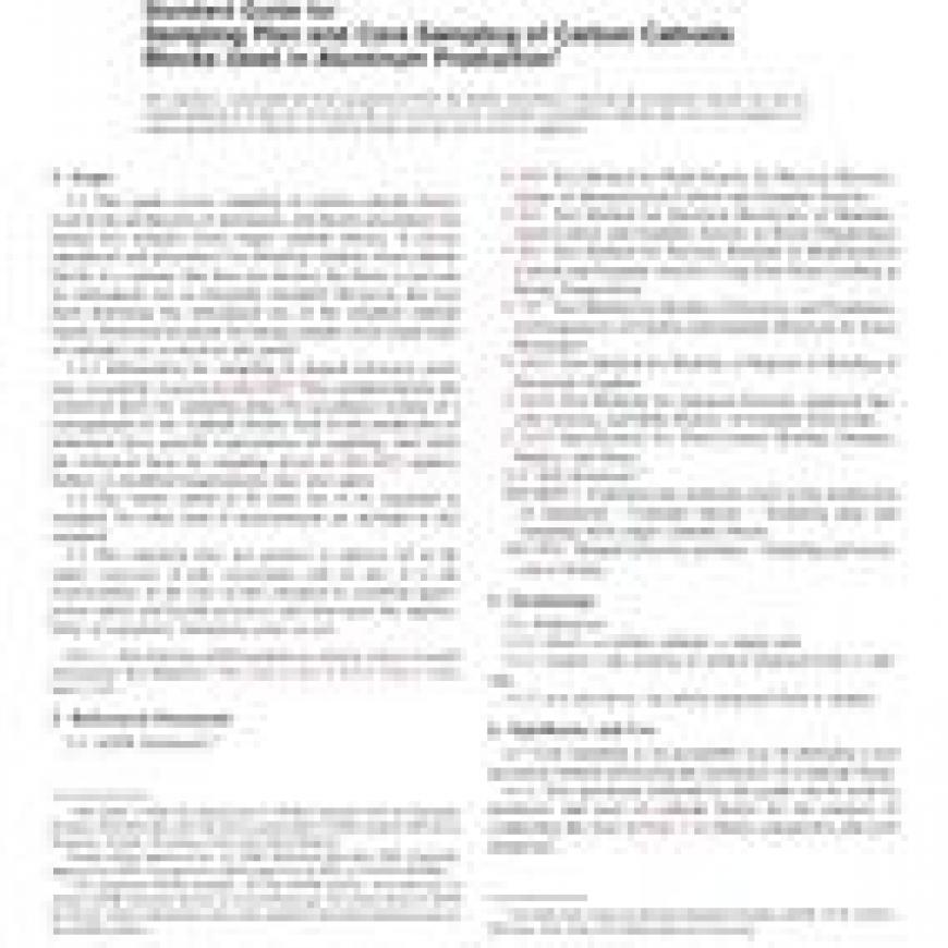 1.1 This guide covers sampling of carbon cathode blocks used in the production of aluminum, and details procedures for taking test samples from single cathode blocks. It covers equipment and procedures for obtaining samples from cathode blocks in a manner that does not destroy the block or prevent its subsequent use as originally intended. However, the user must determine the subsequent use of the sampled cathode blocks. Preferred locations for taking samples from single units of cathodes are covered in this guide.