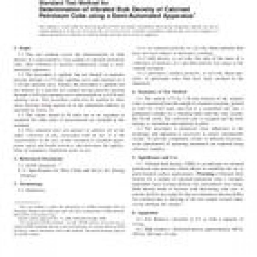 1.1 This test method covers the determination of bulk density of a representative 2-kg sample of calcined petroleum coke, after vibration to increase compaction, using a semi-automatic apparatus.
