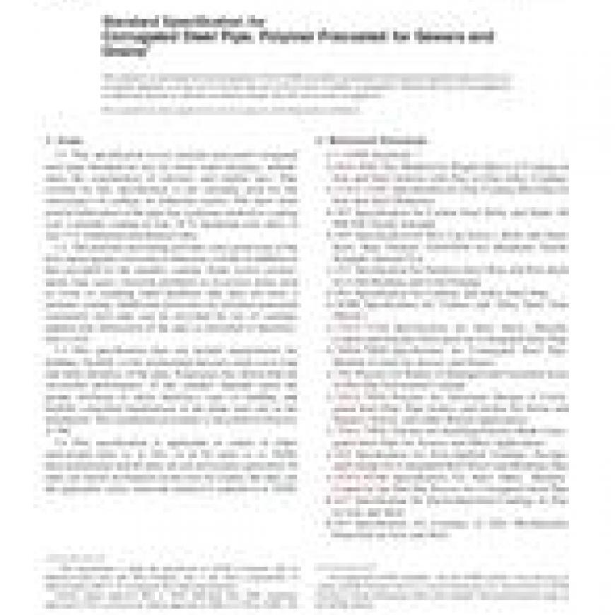 1.1 This specification covers polymer precoated corrugated steel pipe intended for use for storm water drainage, underdrains, the construction of culverts, and similar uses. Pipe covered by this specification is not normally used for the conveyance of sanitary or industrial wastes. The steel sheet used in fabrication of the pipe has a polymer protective coating over a metallic coating of zinc, 55 % aluminum-zinc alloy, or zinc-5 % aluminum-mischmetal alloy.