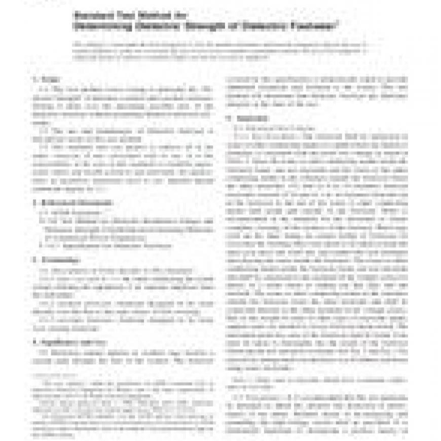 1.1 This test method covers testing to determine the Dielectric Strength of dielectric overfoot and overshoe footwear. Testing is done over the maximum possible area of the dielectric footwear without permitting flashover between electrodes.