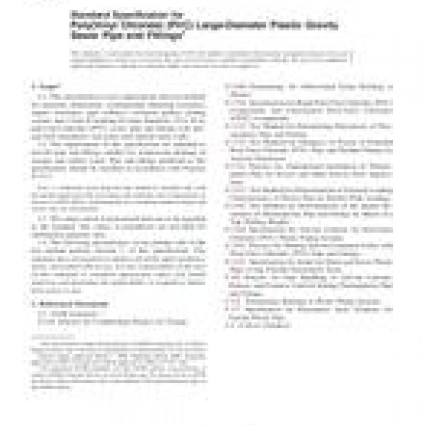 1.1 This specification covers requirements and test methods for materials, dimensions, workmanship, flattening resistance, impact resistance, pipe stiffness, extrusion quality, joining system, and a form of marking for large diameters, 18 to 48 in. poly(vinyl chloride) (PVC) sewer pipe and fittings with integral bell elastomeric seal joints and smooth inner walls.