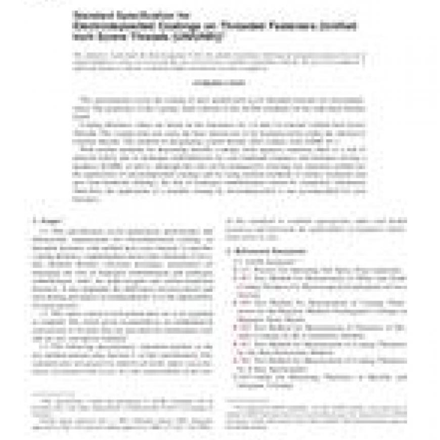 This specification covers application, performance and dimensional requirements for electrodeposited coatings on threaded fasteners with unified inch screw threads. It specifies coating thickness, supplementary hexavalent chromate or trivalent chromite finishes, corrosion resistance, precautions for managing the risk of hydrogen embrittlement and hydrogen embrittlement relief for high-strength and surface-hardened fasteners. The electrodeposited coating as ordered shall cover all surfaces and shall meet the requirements prescribed. Coated fasteners, when tested by continuous exposure to neutral salt spray shall show neither corrosion products of coatings (white corrosion) nor basis metal corrosion products (red rust) at the end of the test period. The coating thickness, embrittlement, corrosion resistance, and trivalent chromite finish shall be tested to meet the requirements prescribed.