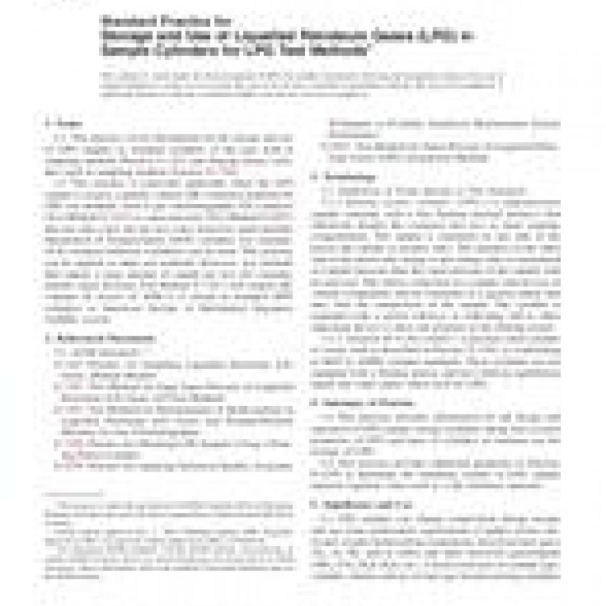 1.2 This practice is especially applicable when the LPG sample is used as a quality control (QC) reference material for LPG test methods, such as gas chromatography (GC) analysis (Test Method D 2163) or vapor pressure (Test Method D 6897) that use only a few mL per test, since relatively small portable Department of Transportation (DOT) cylinders (for example, 20 lb common barbecue cylinders) can be used. This practice can be applied to other test methods. However, test methods that require a large amount of sample per test (for example, manual vapor pressure Test Method D 1267) will require QC volumes in excess of 1000 L if stored in standard DOT cylinders or American Society of Mechanical Engineers (ASME) vessels.