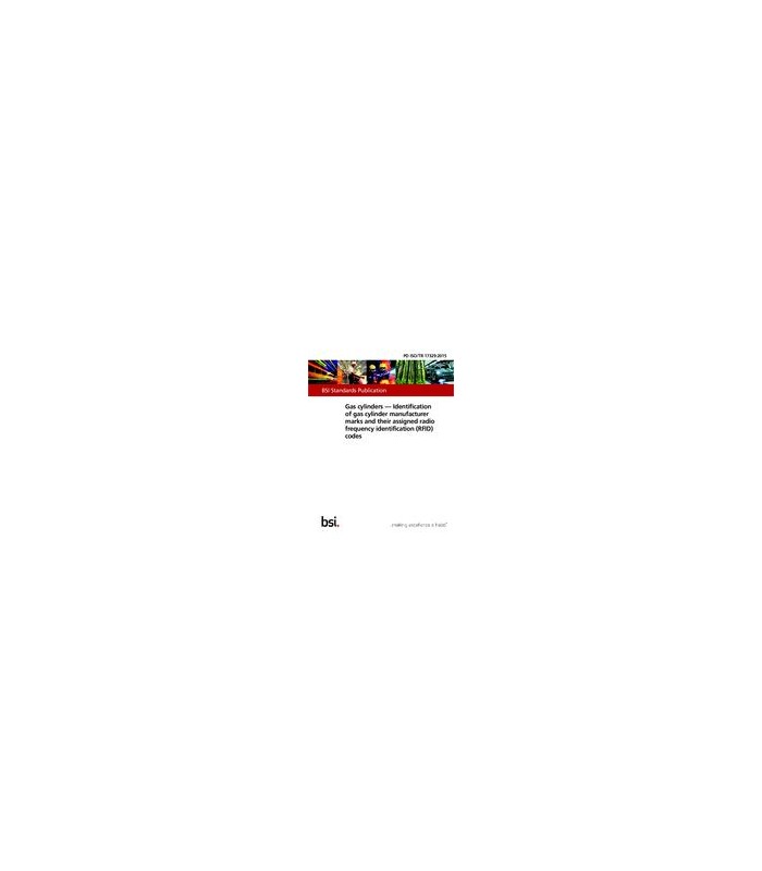 BS PD ISO/TR 17329:2015 provides an inventory, as far as known at time of publication, of manufacturer'sidentification marks and their assigned radio frequency identification (RFID) codes according toISO 21007-1 and ISO 21007-2. The listing includes marks of existing gas cylinder manufacturers, as wellas cylinder manufacturers which have ceased production in the past, but whose cylinders can still be inservice today.