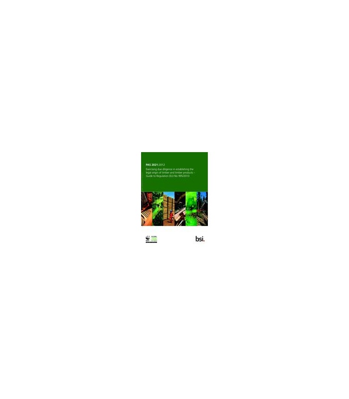 BS PAS 2021:2012 gives guidance on Regulation (EU)No 995/2010 laying down the obligations of operatorswho place timber and timber products on the market(hereafter referred to as the Regulation) [1]. Inparticular it gives guidance on: who is affected by the Regulation and theirobligations (see Clause 3); how to develop and implement a due diligencesystem to minimize the risk of illegal timber in thesupply chain (see Clause 4 and Clause 5); and good practices for responsible trade in timber andtimber products that go beyond the minimumrequirements of the Regulation, includingcommunicating due diligence to interested parties.This PAS also makes reference to the CommissionImplementing Regulation (EU) No 607/2012of 6 July 2012 on the detailed rules concerning the duediligence system and the frequency and nature of thechecks on monitoring organizations as provided forin the Regulation (EU) No 995/2012 of the EuropeanParliament and of the Council laying down theobligations of operators who place timber and timberproducts on the market (hereafter referred to as theImplementing Regulation) [2].