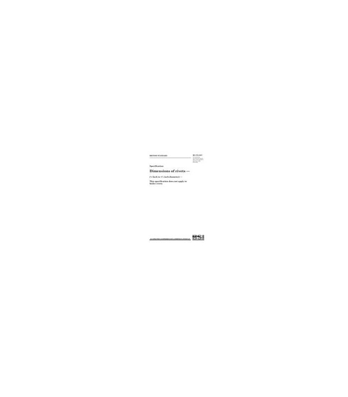 Tabulates diameters (British and metric), with manufacturing tolerances on the shanks. Shapes and sizes of pan head, snap head, and various shapes of countersunk rivets, are illustrated. Does not apply to boiler rivets.