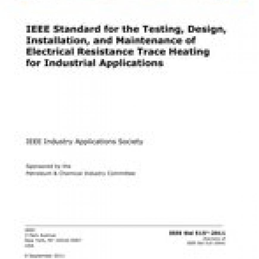 This standard provides requirements for the testing, design, installation, and maintenance of electrical resistance trace heating in general industries as applied to pipelines, vessels, pretraced and thermally insulated instrument tubing and piping, and mechanical equipment. The electrical resistance trace heating is in the form of series trace heaters, parallel trace heaters, and surface heating units. In this standard, the terms hazardous (classified) locations and potentially flammable atmospheres refer to the same conditions.The requirements also include test criteria to determine the suitability of these heating devices utilized in industrial applications as applied in unclassified (ordinary) and hazardous (classified) locations.