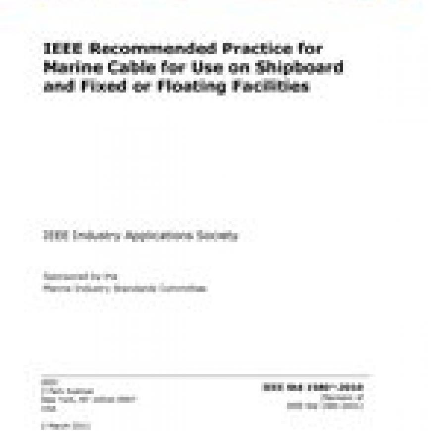 Revision Standard - Active.Requirements are given for single or multiconductor cables, with or without metal armor and/or jacket, and rated 300 V to 35 kV, intended to be installed aboard marine vessels, fixed and floating offshore facilities, and in accordance with industry installation standards and the regulations of the authorities having jurisdiction (AHJ).