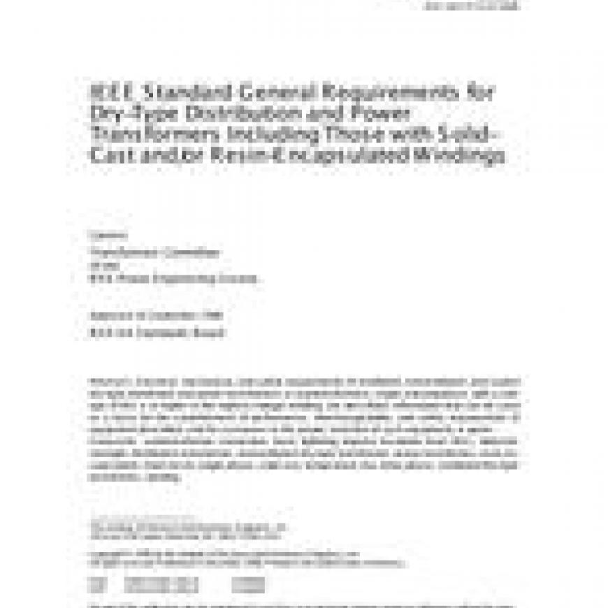 Revision Standard - Superseded.Superseded by IEEE Std C57.12.01-2005 Electrical, mechanical, and safety requirements of ventilated, nonventilated, and sealed dry-type distribution and power transformers or autotransformers, single and polyphase, with a voltage of 601 V or higher in the highest voltage winding, are described. Information that can be used as a basis for the establishment of performance, interchangeability, and safety requirements of equipment described, and for assistance in the proper selection of such equipment, is given.