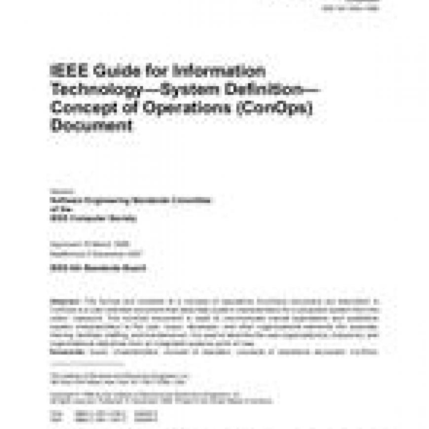 New IEEE Standard - Superseded.Replaced by ISO/IEC/IEEE 29148:2011. The format and contents of a concept of operations (ConOps) document are described. AConOps is a user-oriented document that describes system characteristics for a proposed system from theusersO viewpoint. The ConOps document is used to communicate overall quantitative and qualitativesystem characteristics to the user, buyer, developer, and other organizational elements (for example,training, facilities, staffing, and maintenance). It is used to describe the user organization(s), mission(s), andorganizational objectives from an integrated systems point of view.