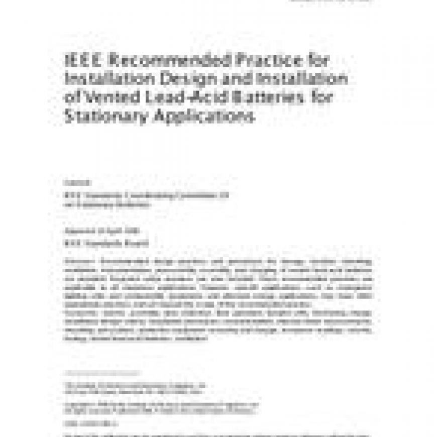 This recommended practice provides recommended design practices and procedures for storage, location, mounting, ventilation, instrumentation, preassembly, assembly and charging of vented lead-acid batteries.