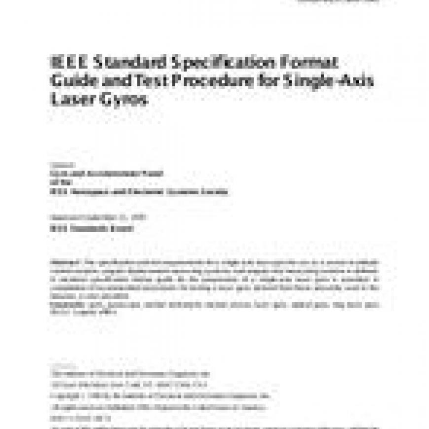 Revision Standard - Superseded.The specification and test requirements for a single-axis laser gyro for use as a sensor in attitude control systems, angular displacement measuring systems, and angular rate measuring systems is defined. A standard specification format guide for the preparation of a single-axis laser gyro is provided. A complication of recommended procedures for testing a laser gyro, derived from those presently used in the industry, is also provided.