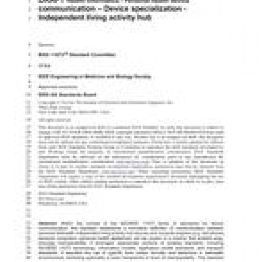 Revision Standard - Active - Draft.Within the context of the ISO/IEEE 11073 family of standards for device communication, this standard establishes a normative definition of communication between personal telehealth independent living activity hub devices and compute engines (e.g. cell phones, personal computers, personal health appliances, set top boxes) in a manner that enables plug-and-play interoperability. It leverages appropriate portions of existing standards including ISO/IEEE 11073 terminology, information models, application profile standards, and transport standards. It specifies the use of specific term codes, formats, and behaviors in telehealth environments restricting optionality in base frameworks in favor of interoperability. This standard defines a common core of communication functionality for personal telehealth independent living activity hubs.