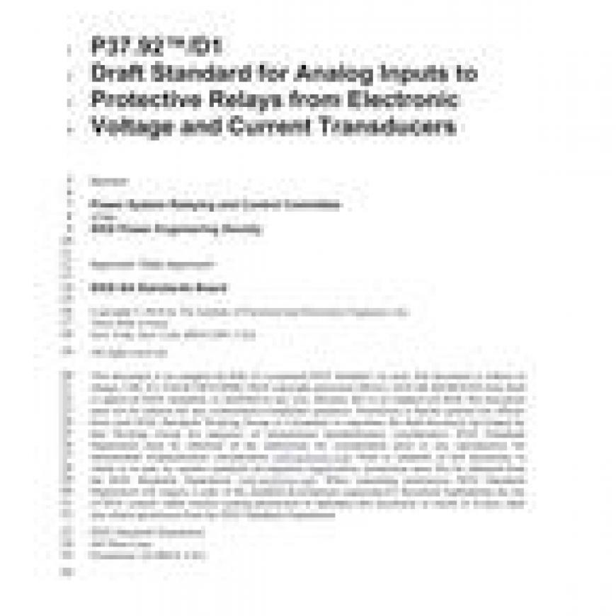 This standard specifies requirements for analog signals, emanating from electronic voltage and current transducers, that are inputted to protective relays. These requirements include signal level, frequency bandwidth, and dynamic range. The standard recognizes that other substation electronic devices utilizing voltage and current waveform measurements may connect to the same transducers.