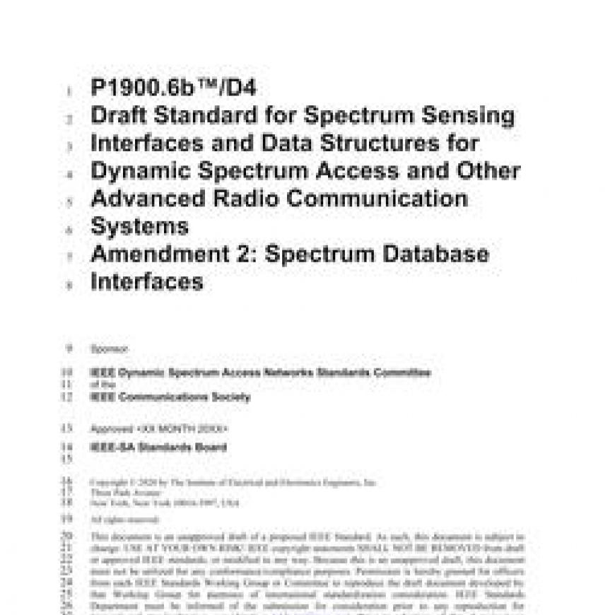 Amendment Standard - Active - Draft.This amendment to IEEE Std 1900.6-2011 adds procedures, protocols, and message format specifications for the exchange of sensing related data, control data, and configuration data between spectrum sensors and spectrum databases. In addition, it adds specifications for the exchange of sensing related data between the data archive and spectrum databases, and the cognitive engine and spectrum databases.