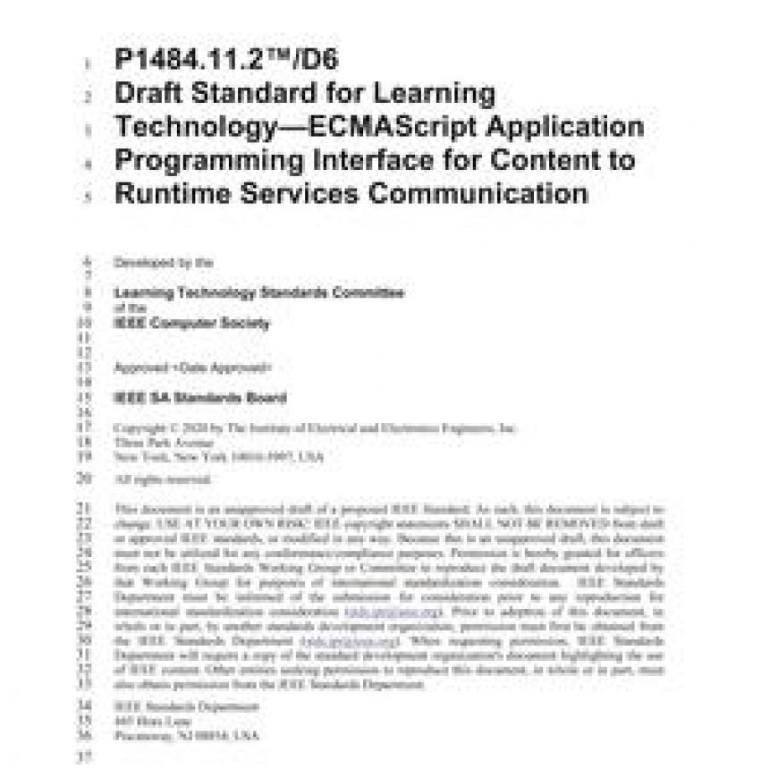Revision Standard - Active - Draft.This Standard describes an ECMAScript application programming interface (API) for content-to-runtime-services communication. It is based on a current industry practice called "CMI-computer managed instruction." This API enables the communication of information between content and a runtime service (RTS) typically provided by a learning management system (LMS) via common API services using the ECMAScript language. The purpose of this Standard is to build consensus around, resolve ambiguities, and correct defects in existing specifications for an ECMAA?Script API for ex-changing data between learning-related content and an LMS.