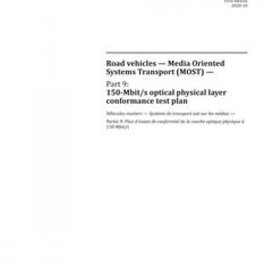 ISO 21806-9:2020 specifies the conformance test plan for the 150-Mbit/s optical physical layer for MOST (MOST150 oPHY), a synchronous time-division-multiplexing network.