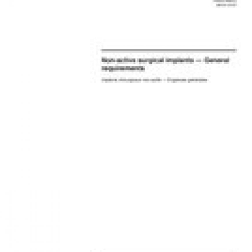 ISO 14630:2012 specifies general requirements for non-active surgical implants. ISO 14630:2012 is not applicable to dental implants, dental restorative materials, transendodontic and transradicular implants, intra-ocular lenses and implants utilizing viable animal tissue.